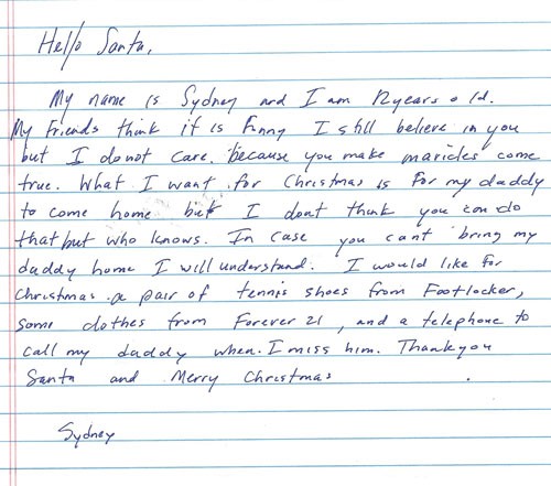 Every year we do adopt letters through the USPS website. Many ask for new shoes, clothes, and other basic needs. They are often written by sad parents who explain they are struggling financially and that their children are too young to write.
